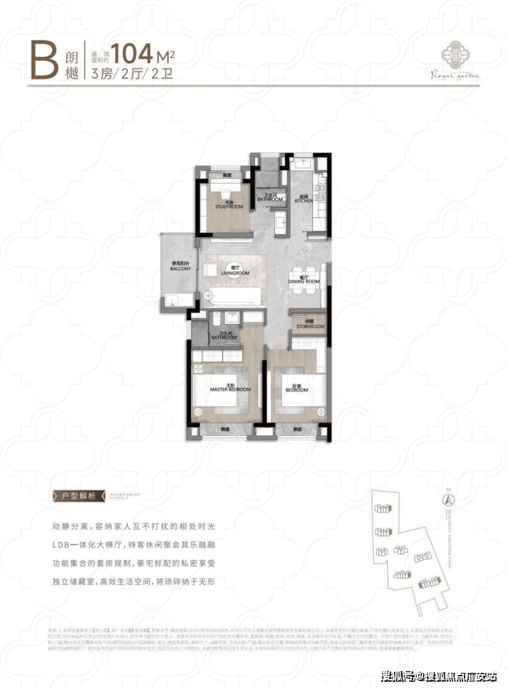 该户型适合三口之家或年轻家庭栖身的动静分区户型,厨房、餐厅、客堂及阳台一体化设想,动静完全分区设想,相当人道化。