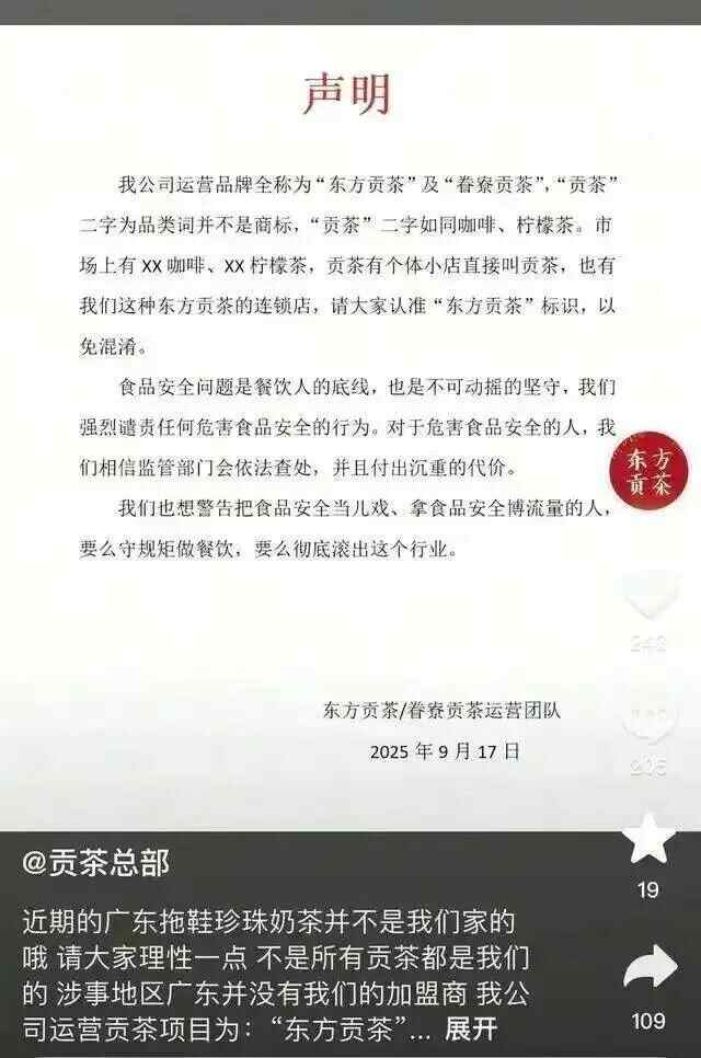 该小吃店店长向引见,发布视频的员工是第一天上班,其上班40分钟就做出此事。其时,该员工行为被发觉,当天已被警方带走查询拜访,视频中的奶茶小料也都扔掉,目前曾经关店整理。9月19日,羊城晚报记者获悉,深圳市市场监管局龙华局对此事高度注沉,敏捷组织法律人员开展核查措置。经查,涉事商家为深圳市龙华区胡记美味美食饮品店,持有无效的《停业执照》和《食物运营许可证》,工做人员持有健康证明上岗,食物原材料按储藏且正在保质期内。法律人员向该店担任人领会,担任人暗示该视频拍摄者为该伙计工,9月17日正式入职上班,网上传播的视频为9月17日拍摄。门店担任人于当天发觉该视频后已当即报警,该名员工被带走查询拜访。目前,该员工已被门行政。同时门店当即遏制发卖相关饮品,将相关加工器具和食材丢弃并自行破产开展整改,截至目前尚未恢复停业。因该视频中显示门店所用食材遭到报酬污染,市场监视部分根据《中华人平易近国食物平安法》对该门店予以就地行政惩罚,责令该门店当即开展全面洁净,严酷按照餐饮办事规范做好整改,后续将亲近整改环境。深圳市龙华方面向记者确认该名员工被行拘,但该员东西体违反哪些法令,未便透露。因为该小吃店店肆门口有“贡茶”字样, “贡茶总部”18日正在视频账号发文称:“近期的广东拖鞋珍珠奶茶并不是我们家的……涉事地域广东并没有加盟商。”